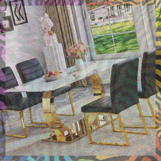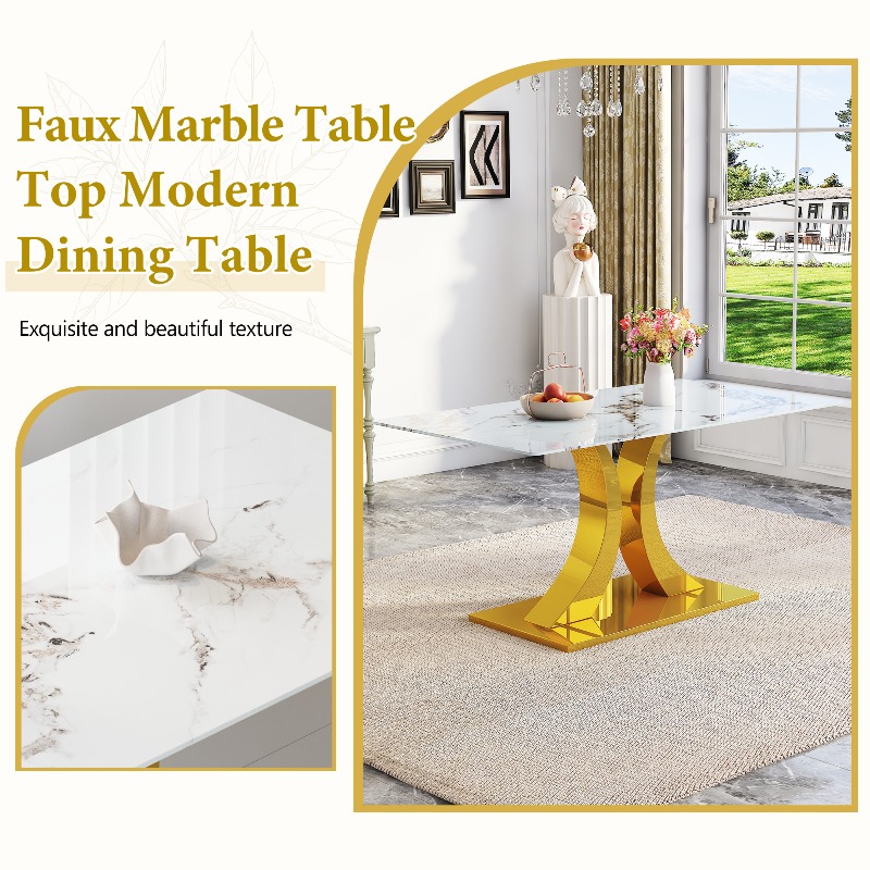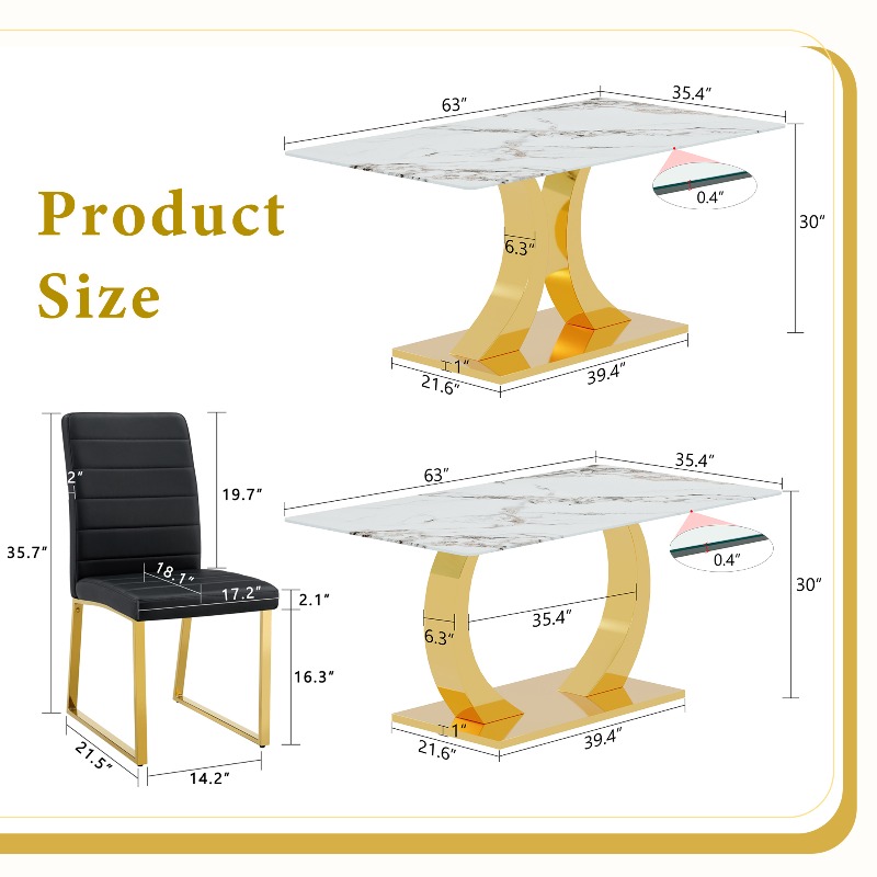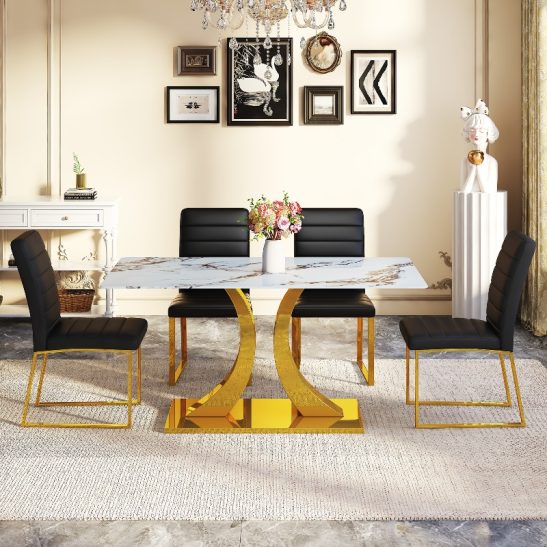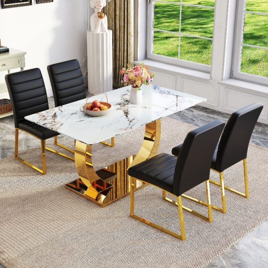 Marble Patterned Tempered Glass Dining Chair Set (Golden Decoration): 63 Inch Dining Table+4 Modern Minimalist Style Dining Chairs